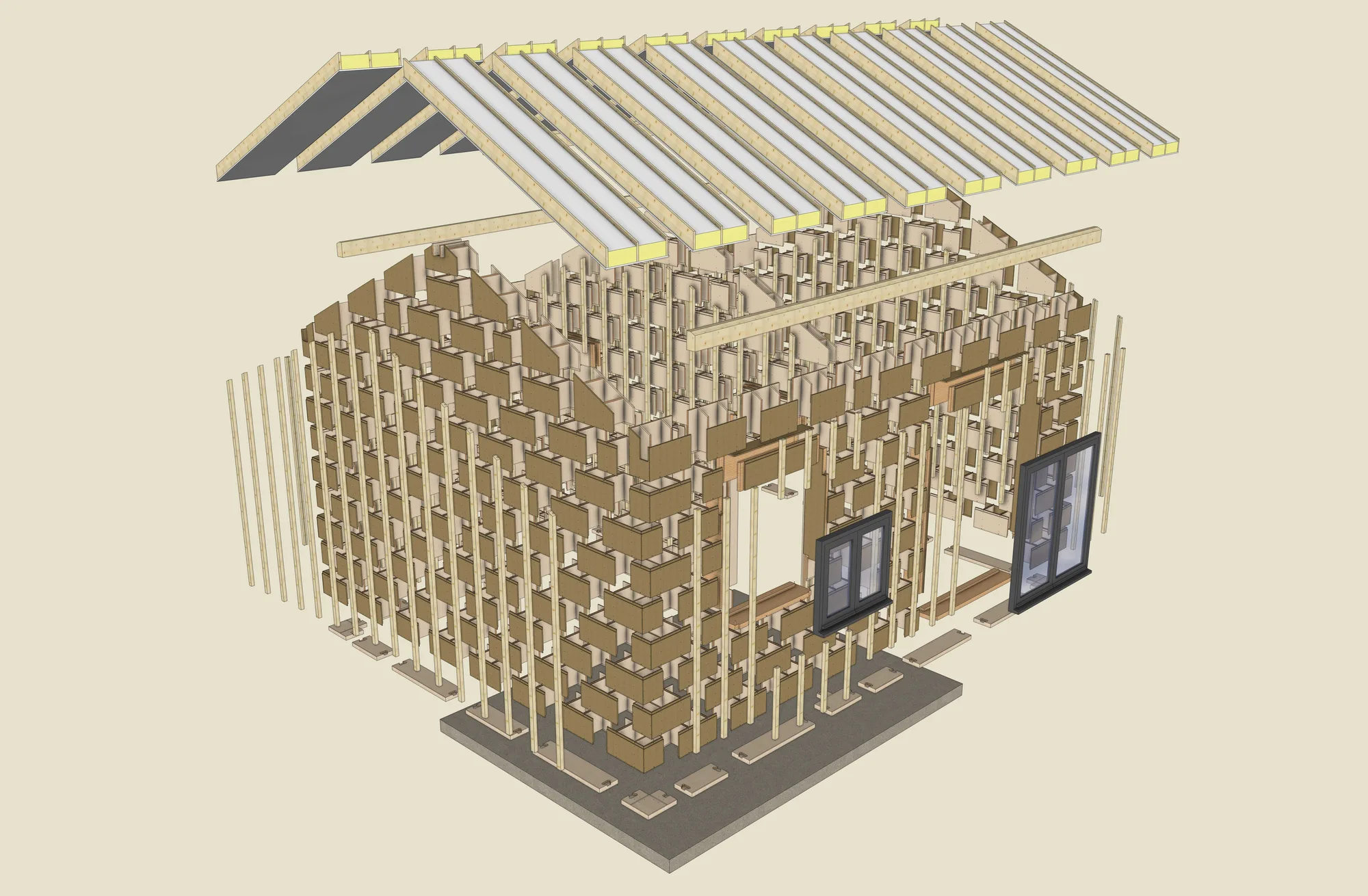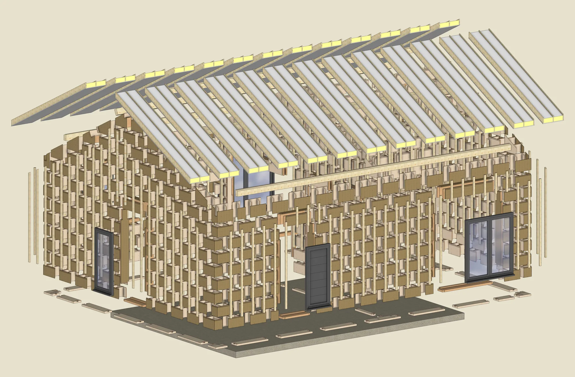 Trois semaines à 3 monteurs méthodiques suffisent aisément à la réalisation d’un ensemble hors d’eau hors d’air de 100 m2. Les éléments sont pensés pour un assemblage fluide et sans erreur.